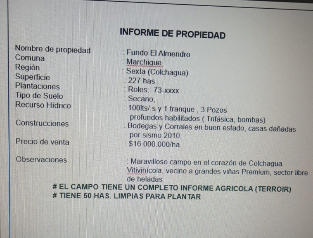 Campo de 227 H. Ideal plantar árboles de cerezos Oportunidad única en el corazón vitivinícola de Colchagua 🍇. Fundo “El Almendro”, en la comuna de Marchigüe: 227 hectáreas con roles propios e inscripción en el Conservador de Bienes Raíces ✅. Suelo de secano, franco limonoso y arcilloso, con buen drenaje 🌱. Recurso hídrico sobresaliente: 100 L/s, tranque y 3 pozos profundos habilitados con bombas trifásicas 💧⚡. Cuenta con bodegas y corrales en buen estado 🏚️🐄. Casas afectadas por el sismo 2010 (para considerar en refacción). Sector libre de heladas ❄️🚫, ideal para frutales de alto valor: cerezos, cítricos y uva de mesa 🍒🍊🍇. 50 hectáreas limpias listas para plantar; el resto requiere limpieza 🧹. Excelente conectividad: caminos asfaltados hasta la entrada 🚗🛣️. Dispone de luz monofásica; trifásica desconectada ⚡. Agua potable disponible 🚰. Campo con informe agrícola completo 📄. Entorno privilegiado, vecino a viñas premium y a 35 km en línea recta del mar 🌊. Marchigüe está a 20 min de Santa Cruz y a aprox. 2 h 5 min de Santiago ⏱️. Un maravilloso campo para inversión agrícola, diversificación o proyecto frutal de escala 🌳📈. Contáctanos para conocer el informe y coordinar visita 👇📞.