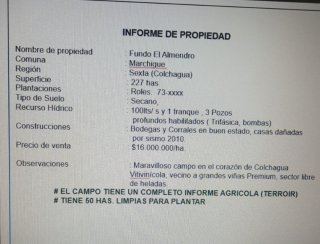 Campo 227H para plantar cerezas 🍒 Maravilloso campo de 227 hectáreas (2.270.000 m²) en el corazón vitivinícola de Colchagua, comuna de Marchigüe, a 20 minutos de Santa Cruz y aprox. 2 horas 5 min de Santiago 🚗 . Suelos franco limosos y arcillosos con buen drenaje, de secano y libres de heladas, aptos para múltiples cultivos: cerezos, cítricos y uva de mesa 🌱. Cuenta con 50 hectáreas limpias listas para plantar y el resto requiere limpieza. Recurso hídrico destacado: 100 l/s, tranque y 3 pozos profundos habilitados con bombas trifásicas 💧. Agua potable disponible. Electricidad monofásica activa; trifásica desconectada ⚡. Caminos asfaltados hasta la entrada del campo 🛣️. Infraestructura: bodegas y corrales en buen estado 🧱🐄. Casas con daños por el sismo 2010. Roles propios inscritos en el Conservador de Bienes Raíces 📜. Orientación norte ☀️. Entorno privilegiado, vecino a viñas premium y a 35 km en línea recta del mar, ideal para manejar zonas de parto y favorecer condiciones climáticas estables 🌬️🌊. Incluye completo informe agrícola 📈. Una oportunidad única para proyectos frutícolas y agrícolas de alta proyección en Colchagua. Contáctanos para más información y coordinar visita 📞✨.